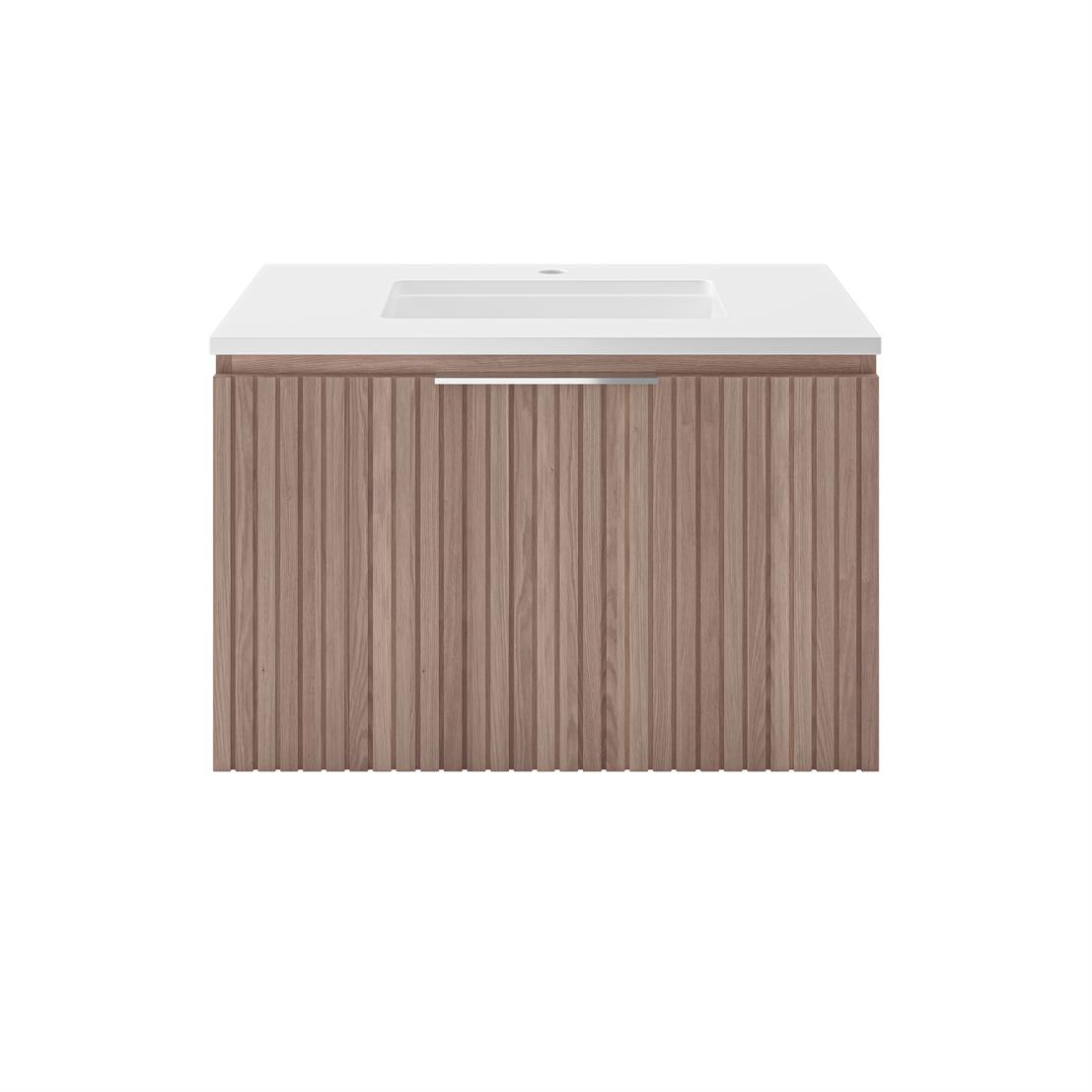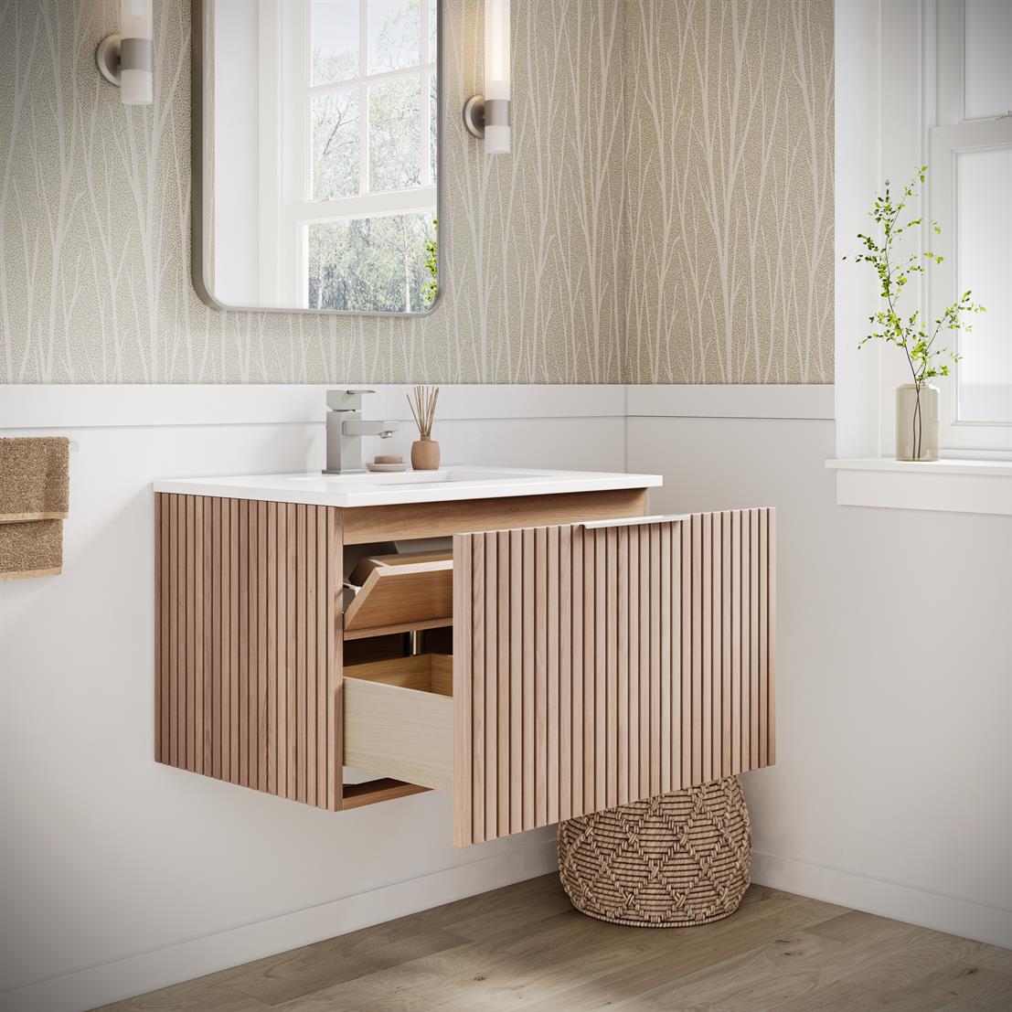 Introducing the Elliot Collection, where modern design meets timeless sophistication. This floating is expertly crafted with a solid wood frame and adorned with a durable white oak veneer that showcases captivating wood graining. The front and sides are detailed with square fluting, adding a layer of texture that enhances its contemporary appeal. The vanity features a generously sized full-face drawer that surprises with a practical tip-out compartment, offering both style and functionality. Its flat handle finger pull design ensures a sleek, uninterrupted facade, perfect for modern bathrooms. The Elliot Collection's Floating design not only saves space but also adds a minimalist touch to your bathroom, making it a standout piece that combines beauty and practicality. Elevate your bathroom with the modern allure of the Elliot Collection.