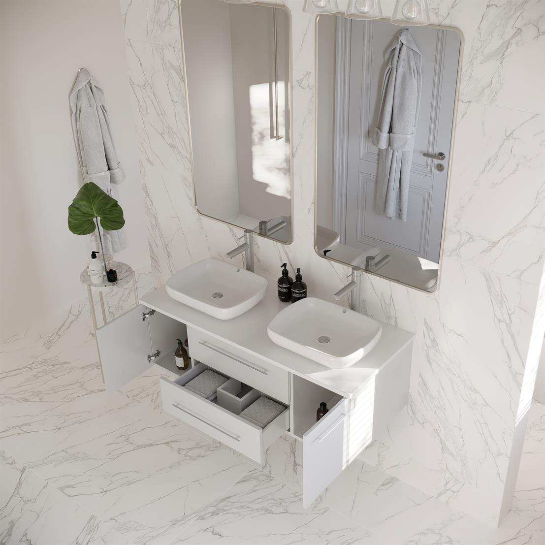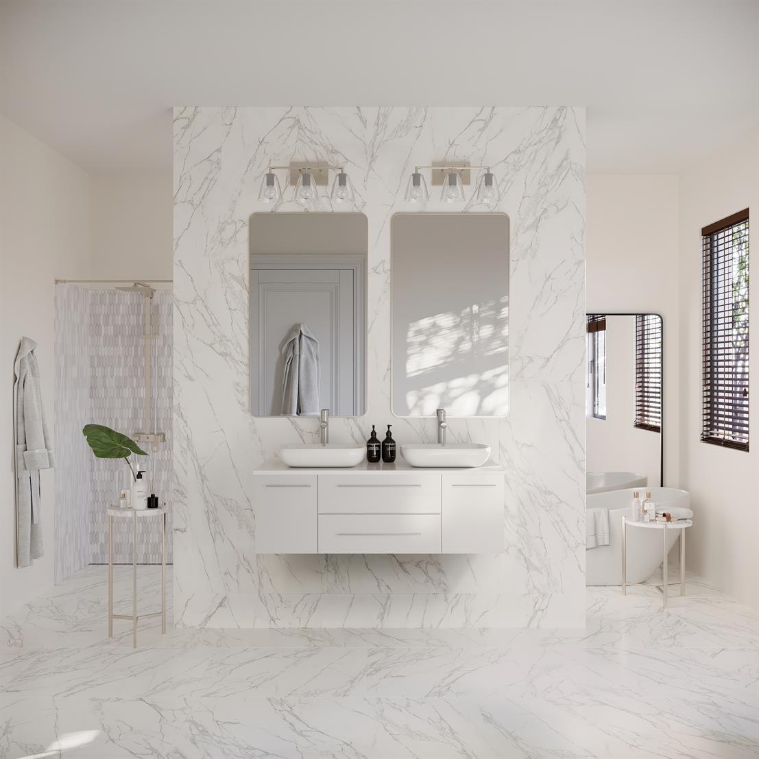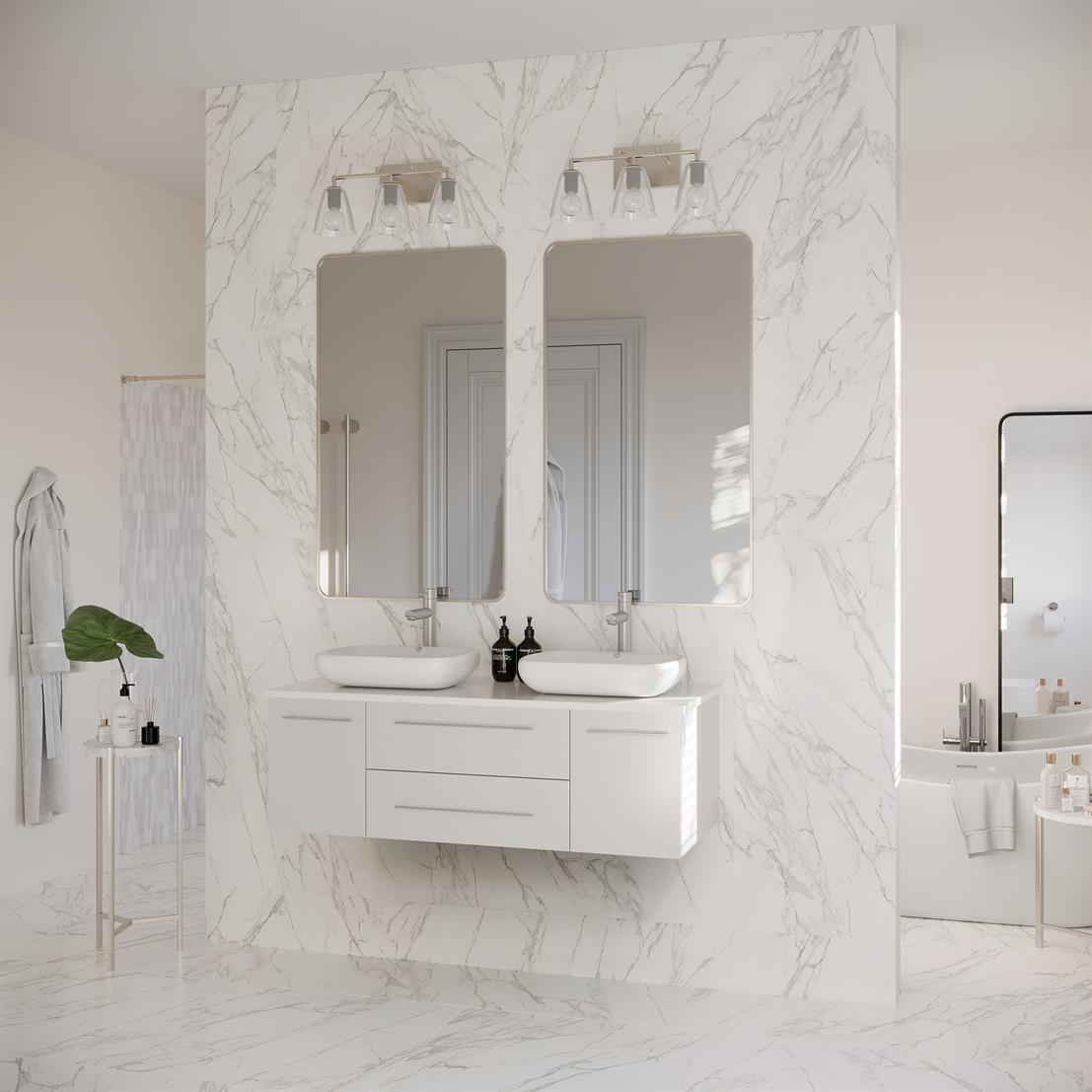 - Wall mount vanity design offers a floating, streamlined appearance and easy cleaning underneath