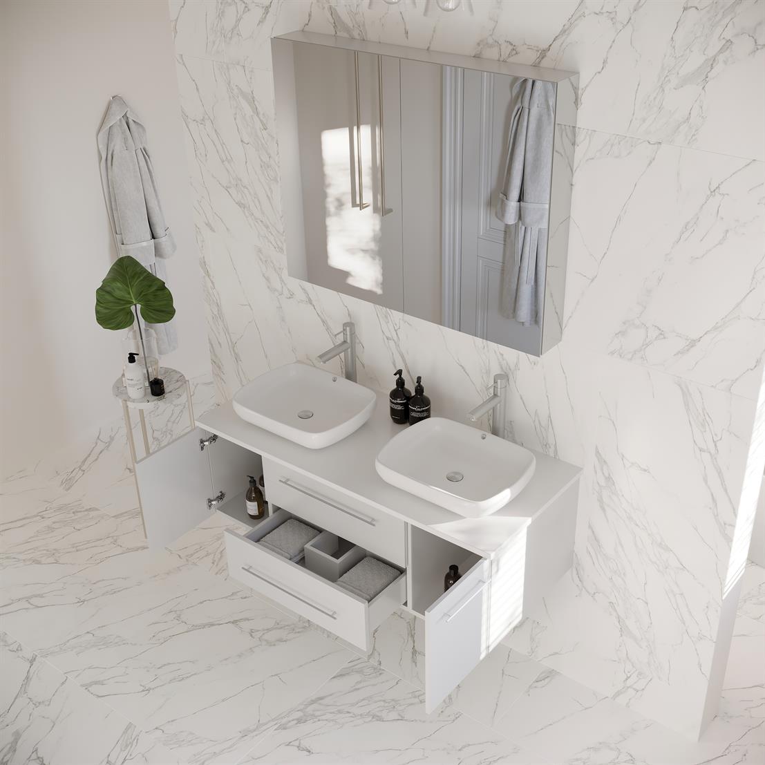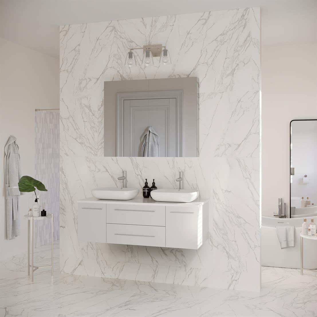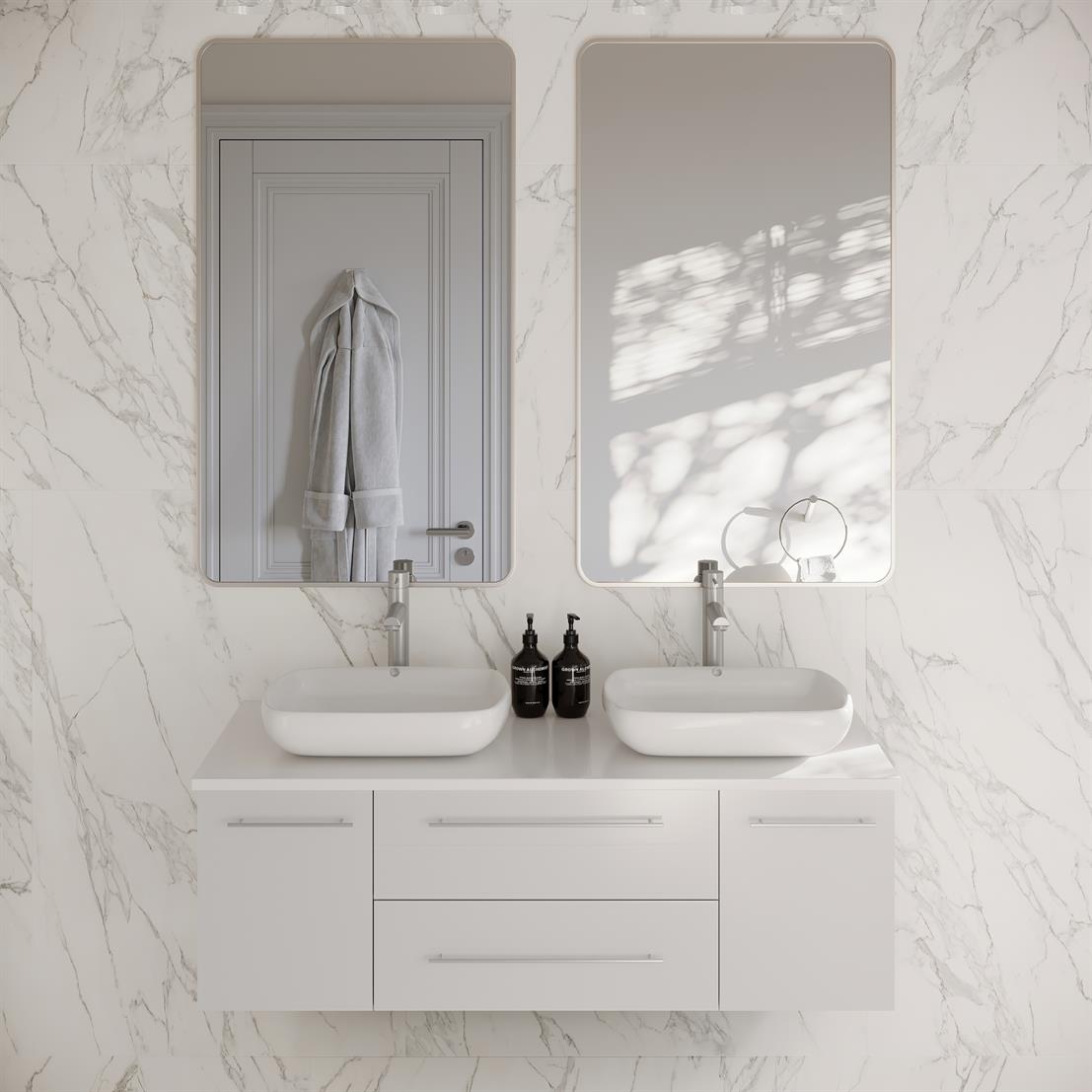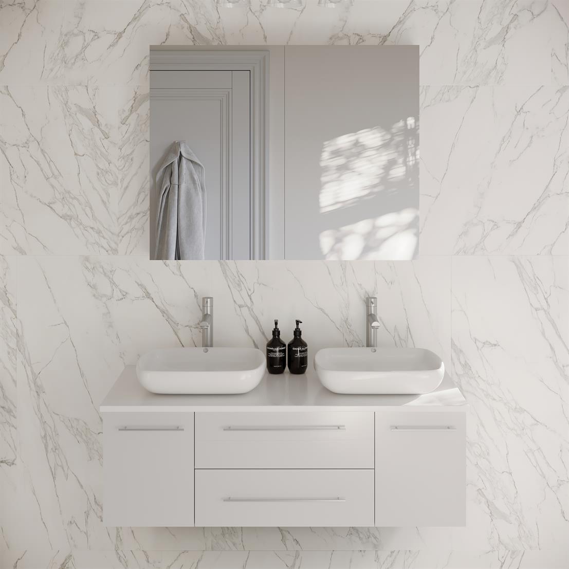 - Wall mount vanity design offers a floating, streamlined appearance and easy cleaning underneath