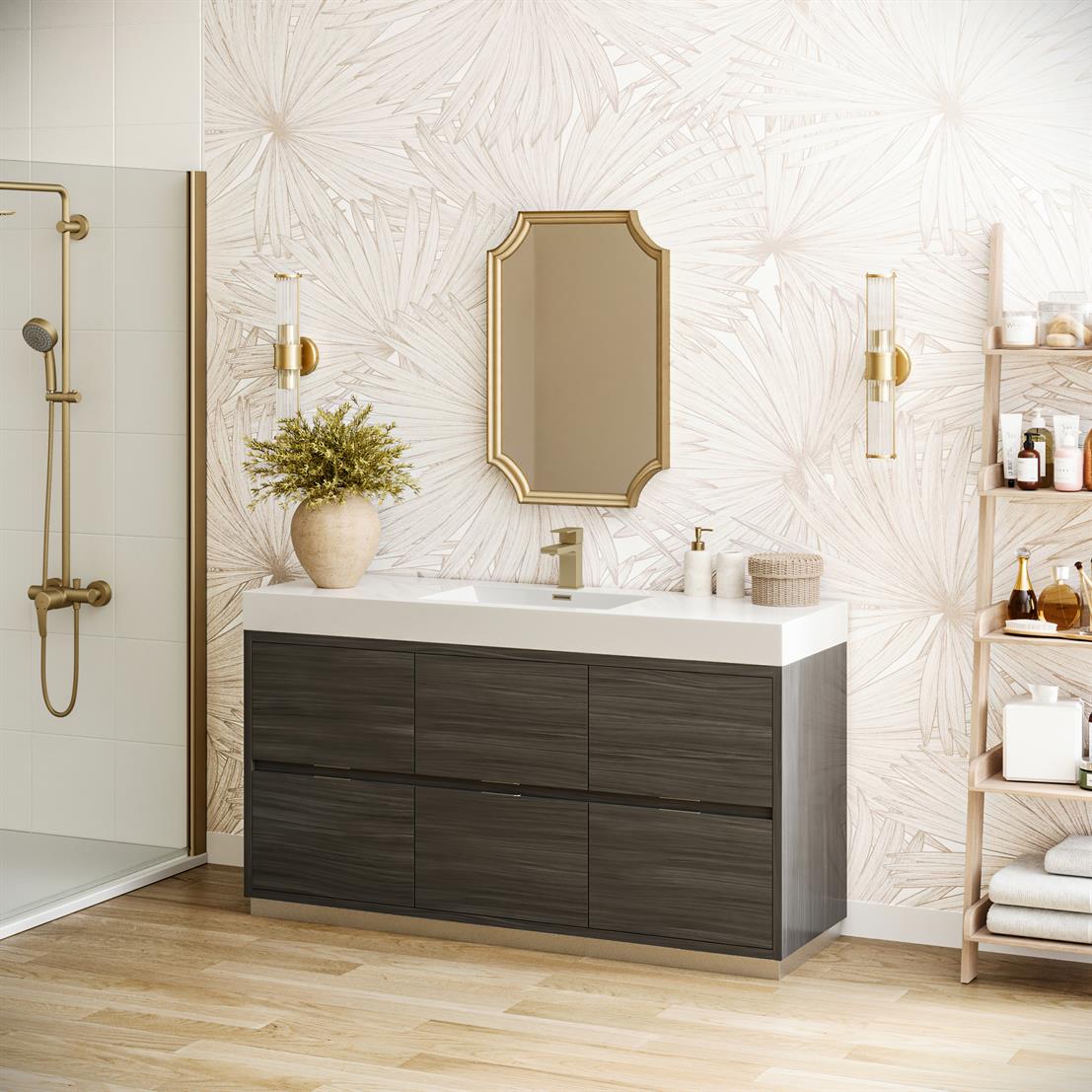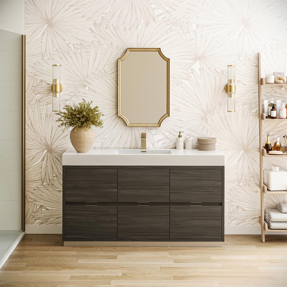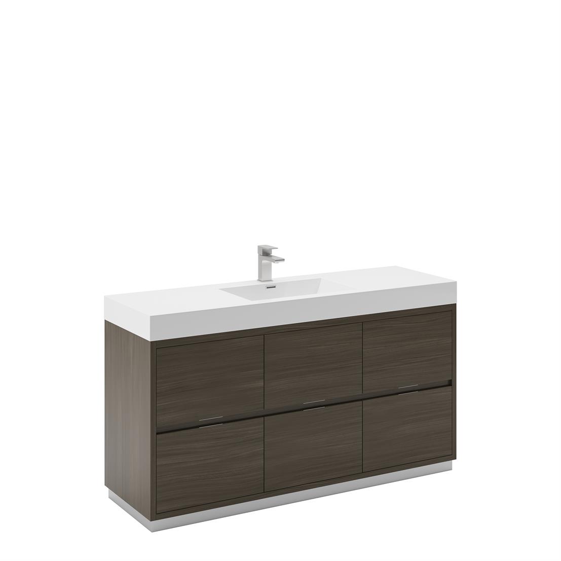 The Fresca Valencia Free Standing Modern Bathroom Vanity is modern elegance at its best. With a lovely rectangular shape, the Gray Oak cabinet measures 60” in width and is ideal for today’s busy family. It offers great storage with six soft-closing drawers, just perfect for organizing all of your daily essentials. To complement the minimalist design, the drawers feature concealed aluminum handles. The cabinet sits on a silver base, adding to its modern look.