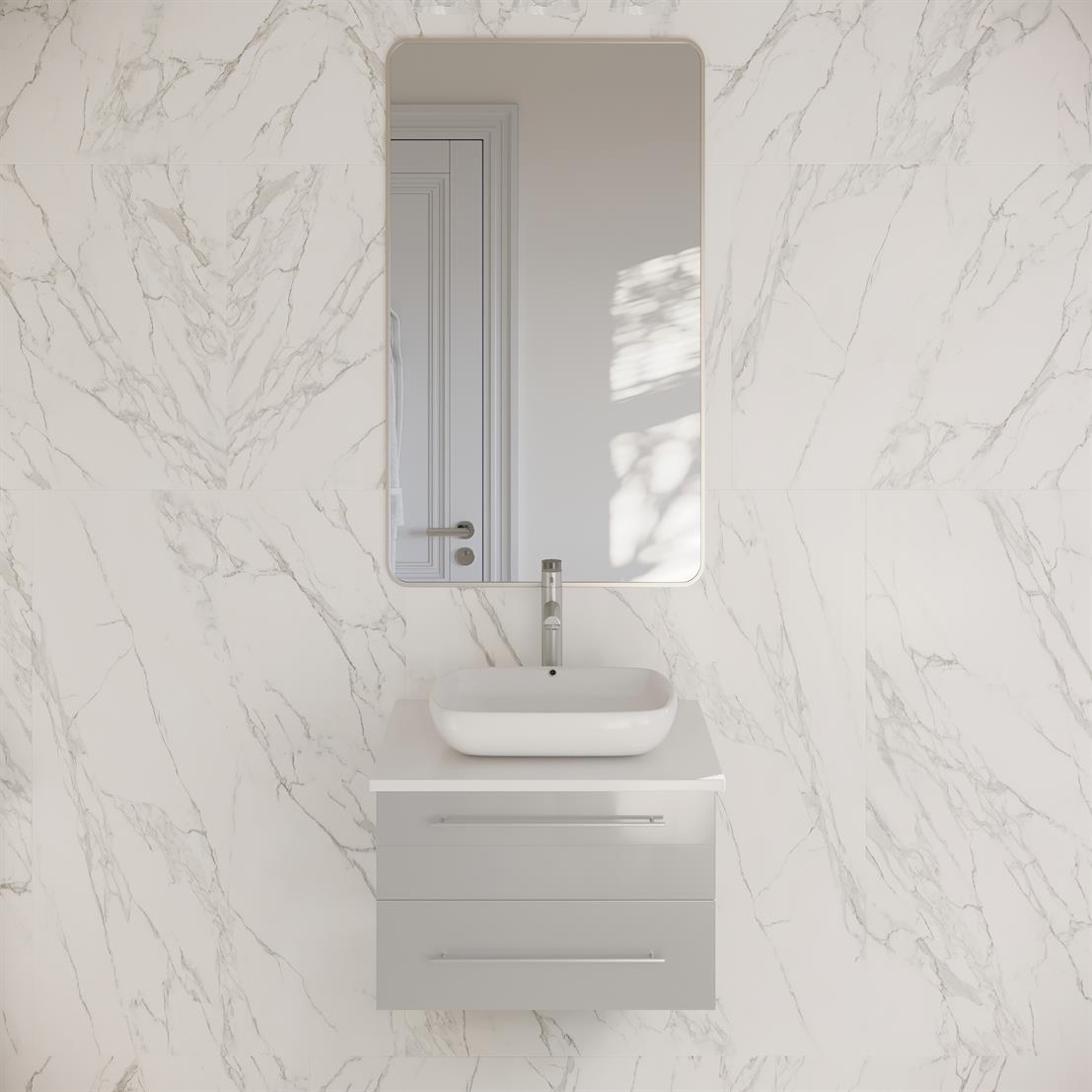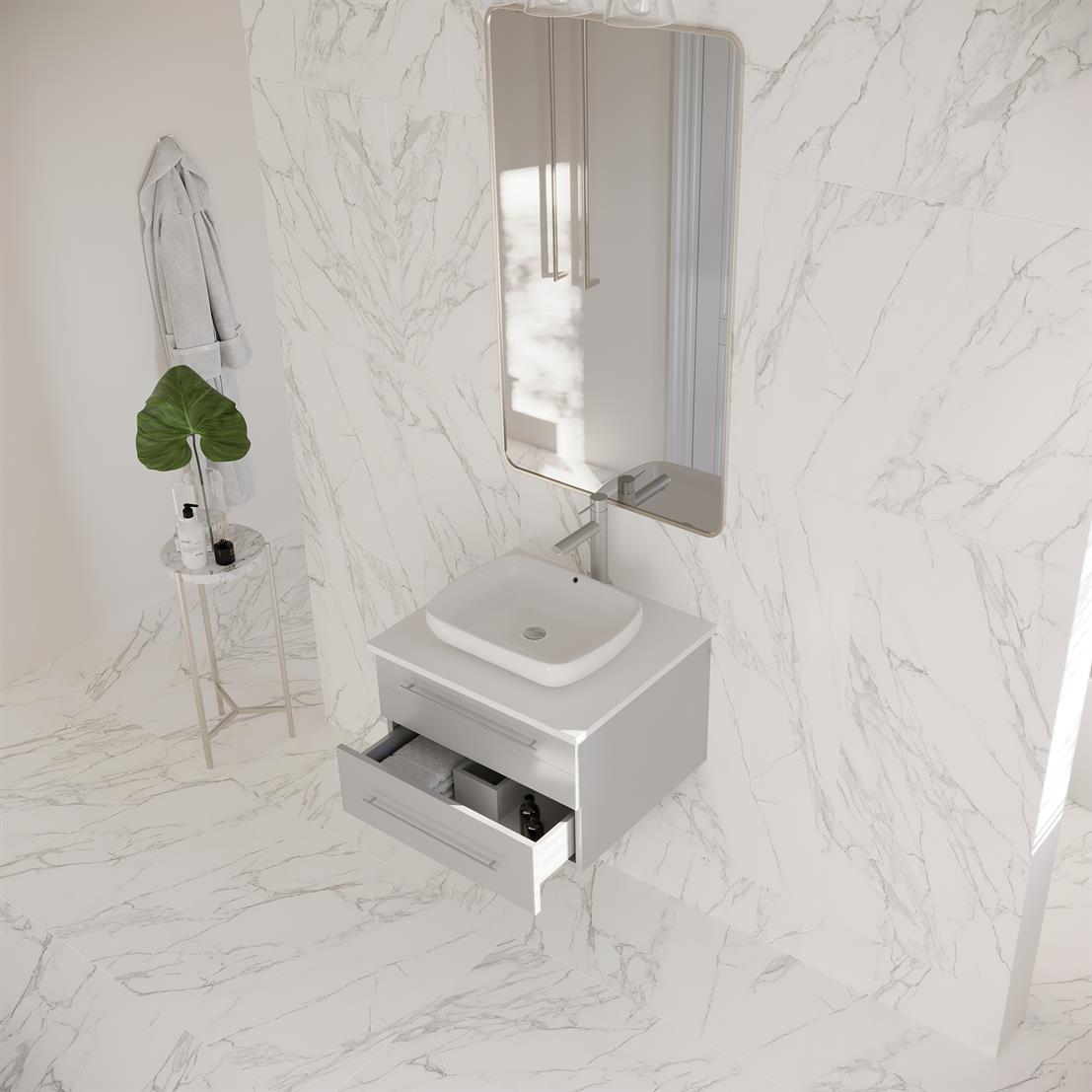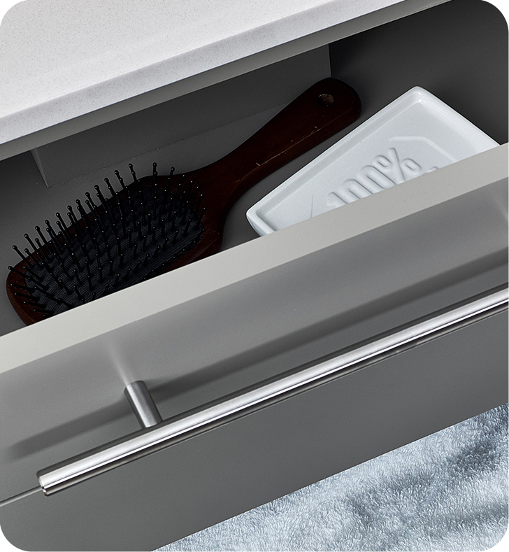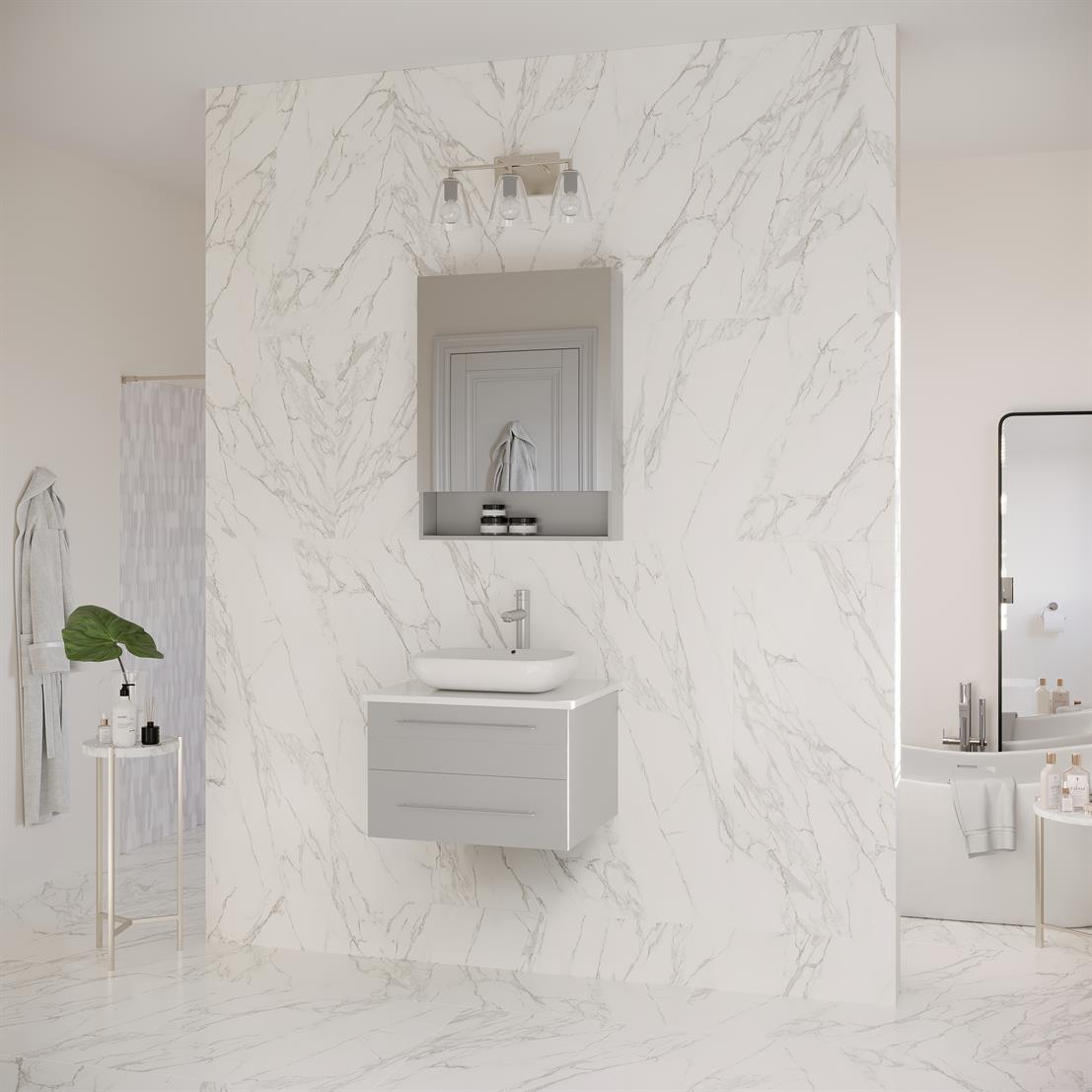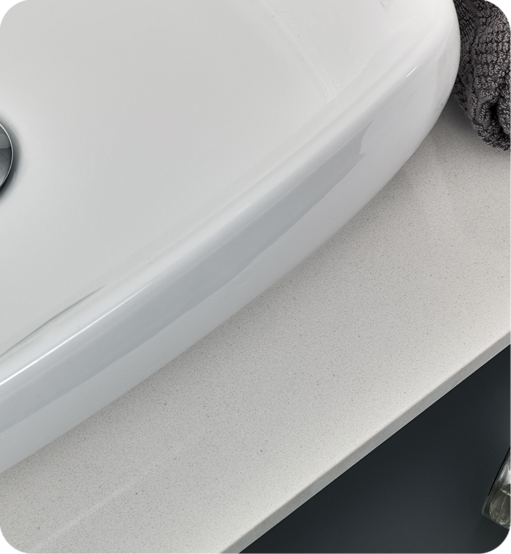 - Wall mount vanity design offers a floating, streamlined appearance and easy cleaning underneath