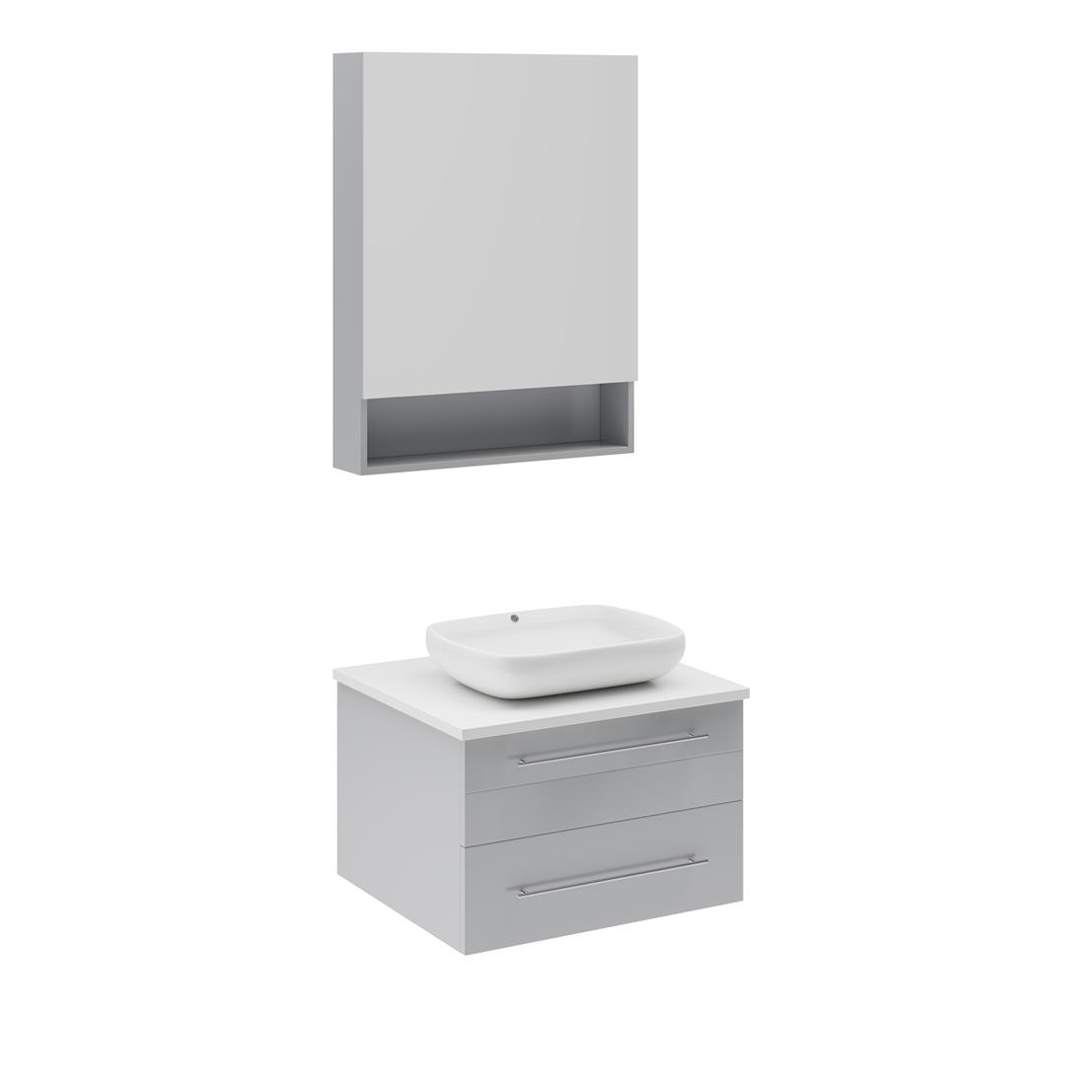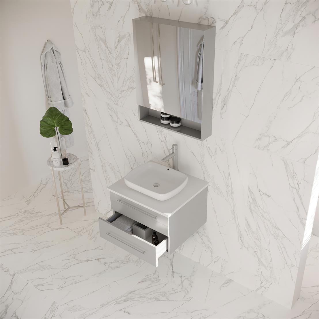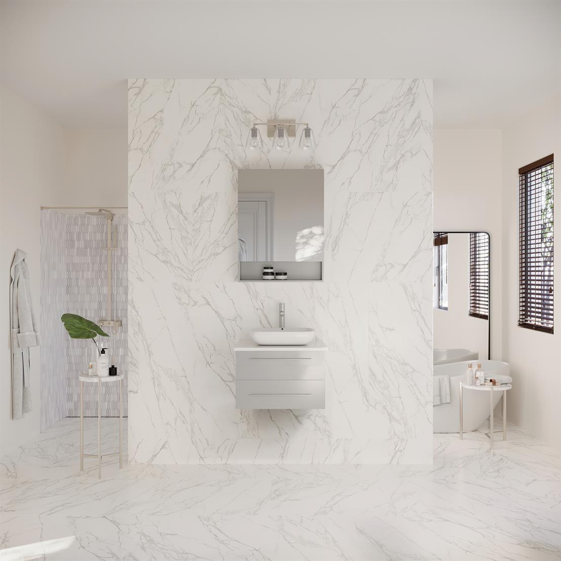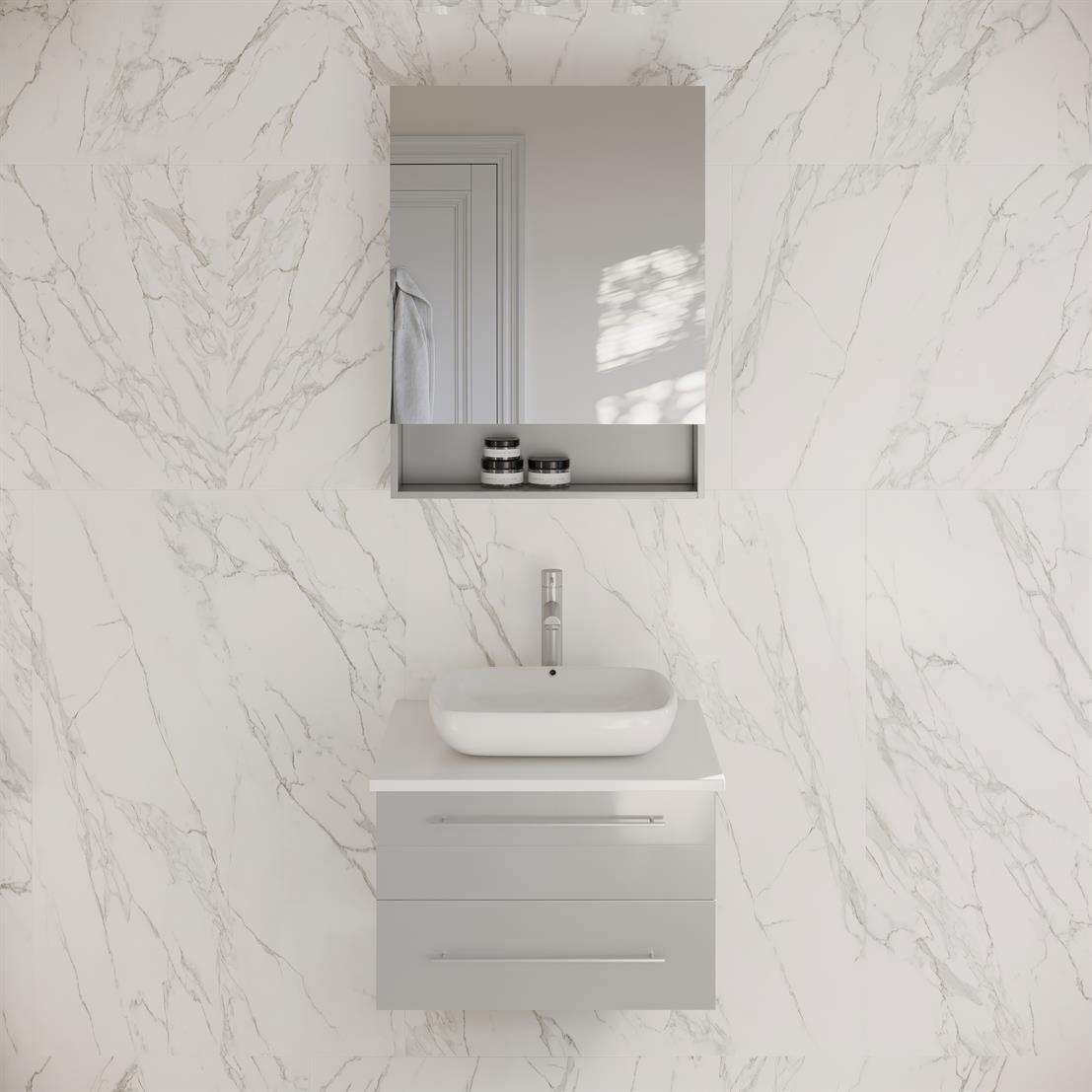 - Wall mount vanity design offers a floating, streamlined appearance and easy cleaning underneath