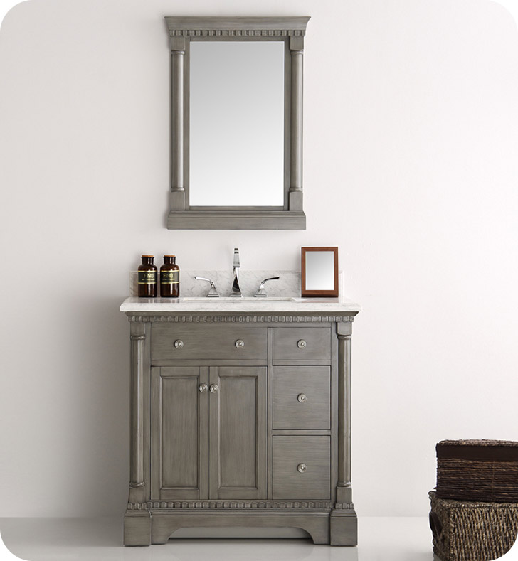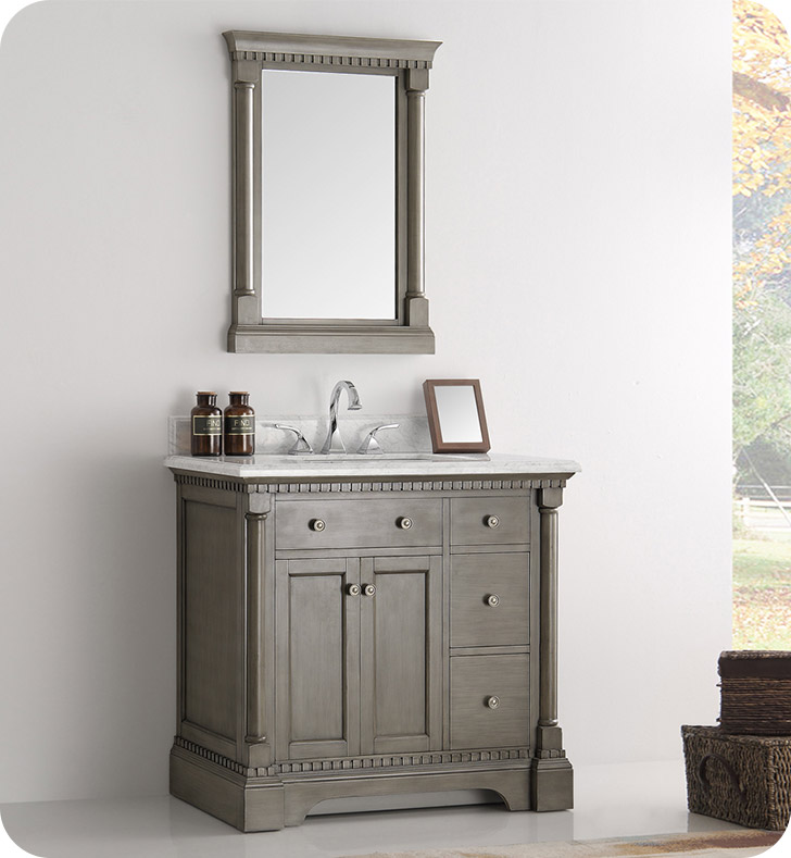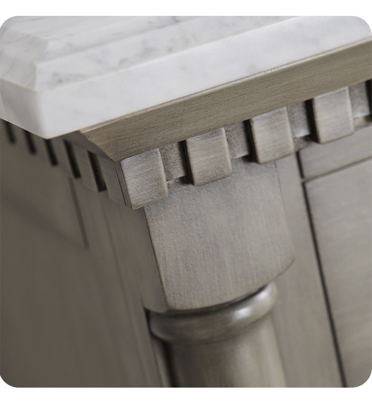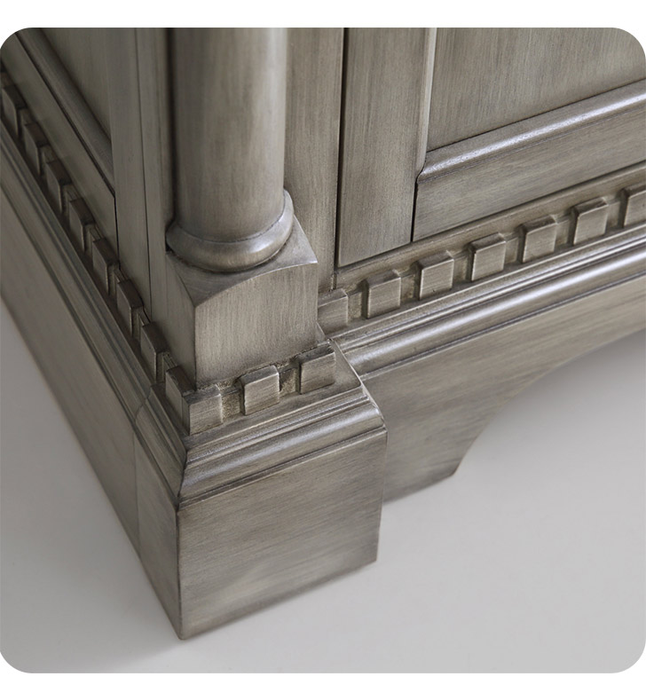 Everything about this vanity has been beautifully designed. Intricately carved columns, decorative molding and dentil cornices elevate the beauty of this traditional vanity which is further enhanced by a sophisticated Antique Silver finish.
