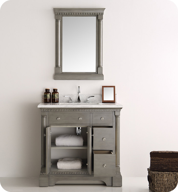 Two soft closing doors open to reveal great under-the-sink storage space, while four soft closing dovetail drawers are perfect for keeping daily needs within reach. Satin nickel handles add to the cabinet’s elegance. Measuring 36” in width, the Fresca Traditional Bathroom Vanity would blend beautifully with any décor.